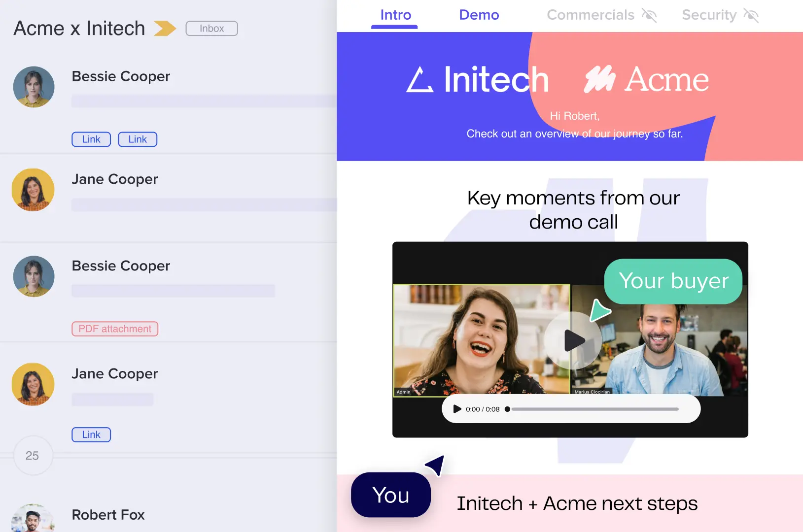 - Share rich content (video, decks, pricing) in one trackable space.
