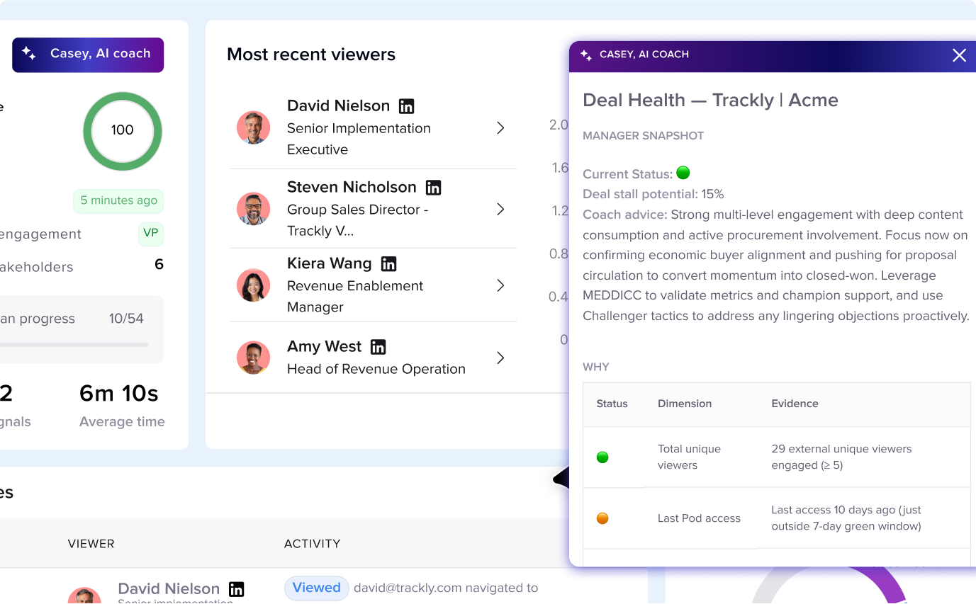 Casey is an always-on AI Deal + Engagement Coach that lives directly inside trumpet Pods. It analyses live buyer engagement and translates signals into tailored coaching, giving sellers the insight and confidence to take the right next step.