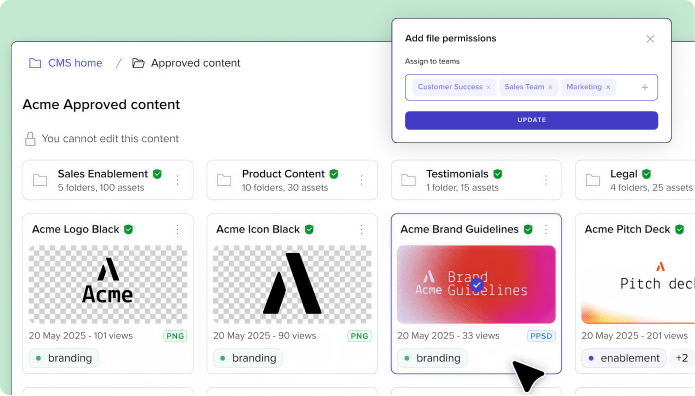 with global updates and permission-based lock-down to safeguard brand integrity and reduce risk. Make changes once and reflect them instantly across your entire team.