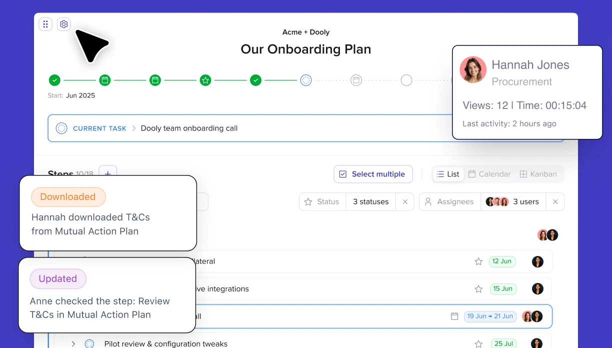 Share clear next steps and deadlines with horizontal progress tracking across sales and onboarding.