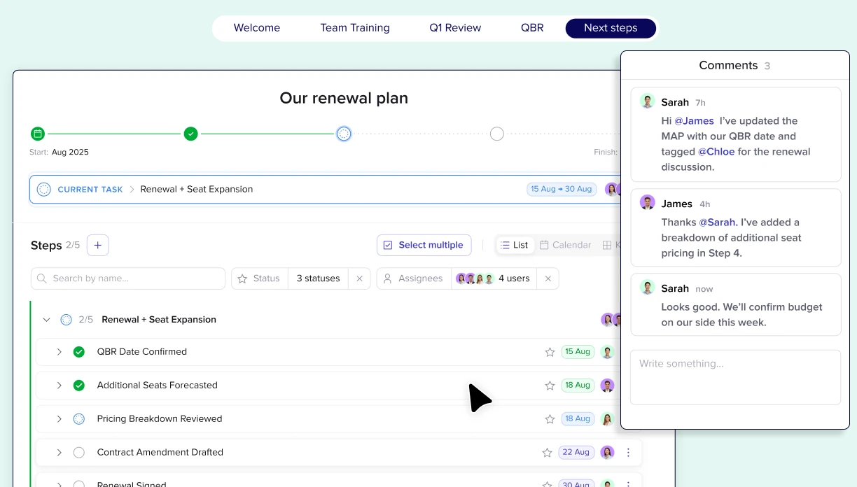 Assign and track ownership in one collaborative space buyers actually use so AEs and CSMs work from the same plan.